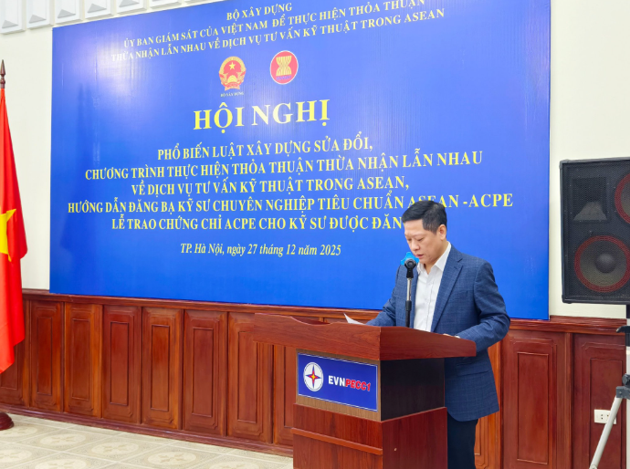 Ngày 27/12/2025, tại Công ty Cổ phần Tư vấn Xây dựng Điện 1 (PECC1), Công ty đã phối hợp với Ủy ban Giám sát của Việt Nam tổ chức Hội nghị "Phổ biến Luật Xây dựng sửa đổi và một số hoạt động liên quan đến Thỏa thuận thừa nhận lẫn nhau về dịch vụ tư vấn kỹ thuật trong ASEAN, đồng thời trao Chứng chỉ ACPE cho các kỹ sư đăng bạ".