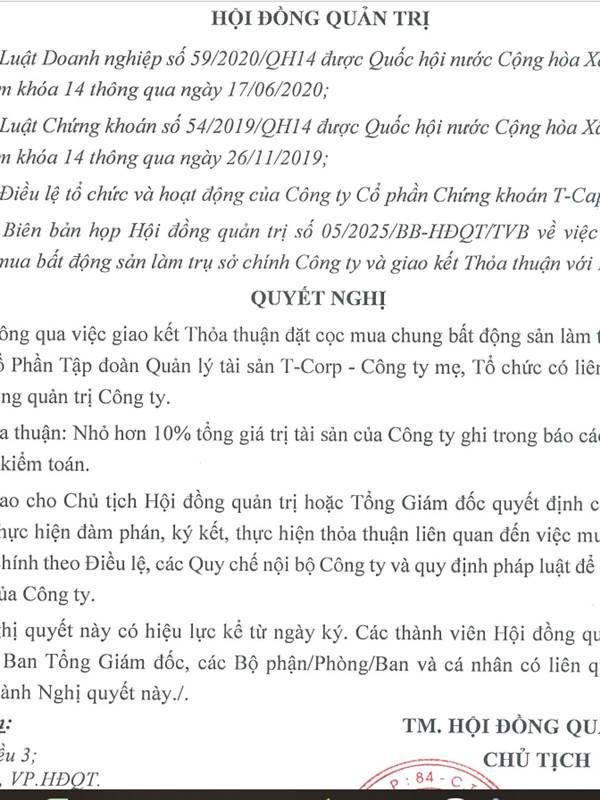 Công ty Cổ phần Chứng khoán T-Cap thông báo Nghị quyết HĐQT về việc thông qua giao kết hợp đồng với bên liên quan như sau: