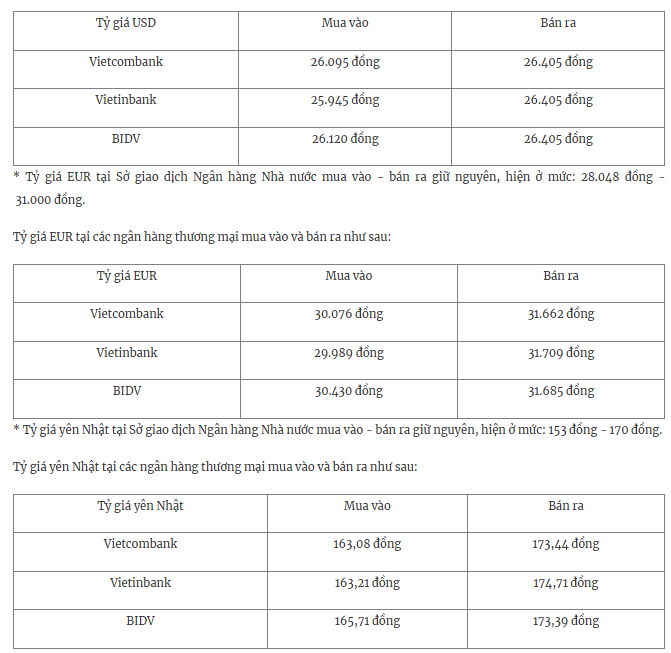 Tỷ giá USD tại các ngân hàng thương mại mua vào và bán ra như sau:
