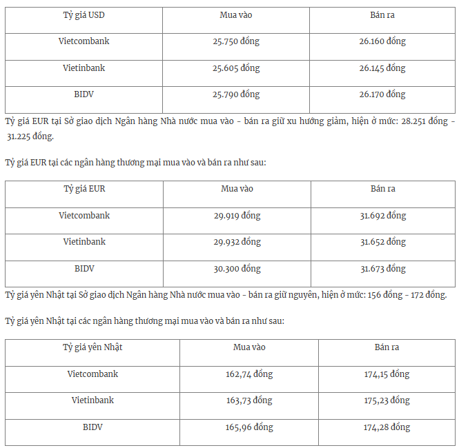 Tỷ giá USD tại các ngân hàng thương mại mua vào và bán ra như sau: