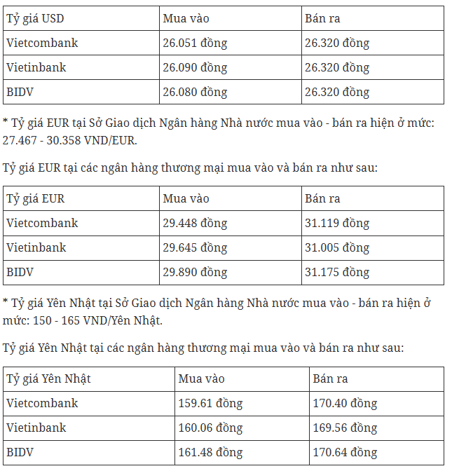 * Tỷ giá tham khảo tại Sở Giao dịch Ngân hàng Nhà nước mua vào - bán ra hiện ở mức: 23.864 - 26.270 VND/USD.