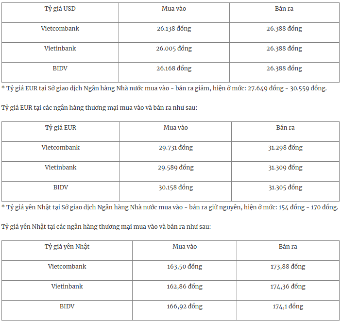 Tỷ giá USD tại các ngân hàng thương mại mua vào và bán ra như sau: