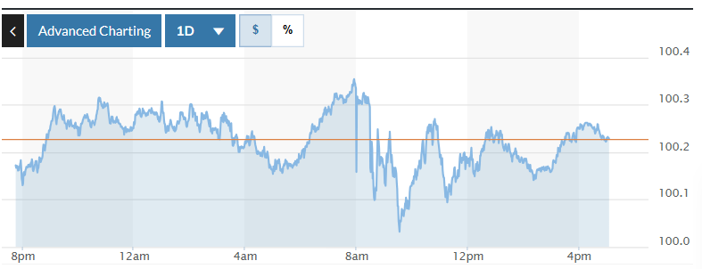 Trong khi đó, trên thị trường Mỹ, chỉ số US Dollar Index (DXY) đo lường biến động đồng bạc xanh với 6 đồng tiền chủ chốt (EUR, JPY, GBP, CAD, SEK, CHF) tăng 0,11%, hiện ở mức 100,23.