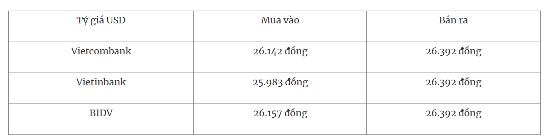Tỷ giá USD tại các ngân hàng thương mại mua vào và bán ra như sau: