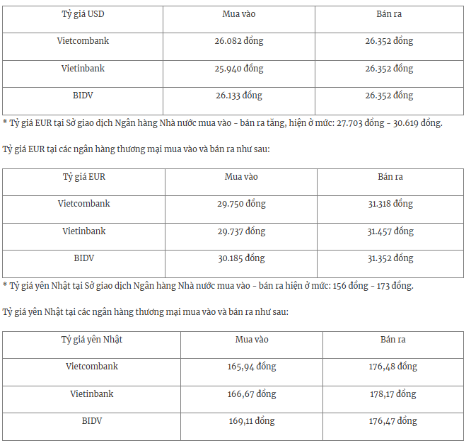 Tỷ giá USD tại các ngân hàng thương mại mua vào và bán ra như sau:
