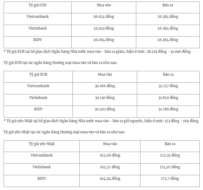 Tỷ giá USD tại các ngân hàng thương mại mua vào và bán ra như sau: