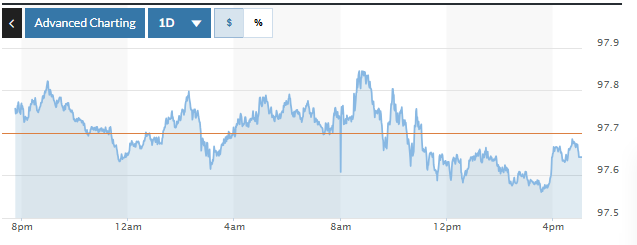 Trên thị trường Mỹ, chỉ số US Dollar Index (DXY) đo lường biến động đồng bạc xanh với 6 đồng tiền chủ chốt (EUR, JPY, GBP, CAD, SEK, CHF) giảm 0,15%, hiện ở mức 97,64.