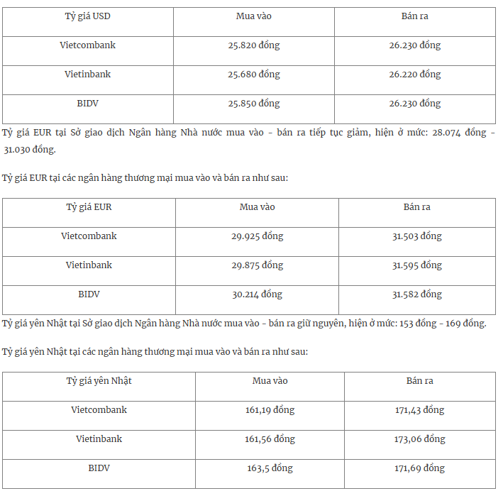 Tỷ giá USD tại các ngân hàng thương mại mua vào và bán ra như sau:
