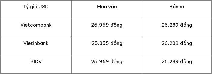 Tỷ giá USD tại các ngân hàng thương mại mua vào và bán ra như sau:
