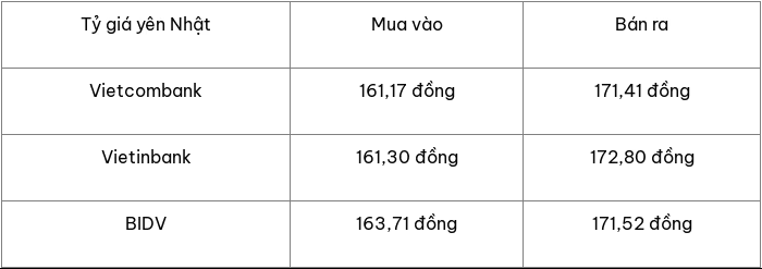 Tỷ giá yên Nhật tại các ngân hàng thương mại mua vào và bán ra như sau: