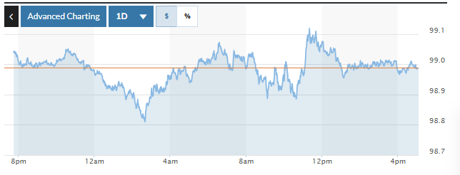 Trên thị trường Mỹ, chỉ số US Dollar Index (DXY) đo lường biến động đồng bạc xanh với 6 đồng tiền chủ chốt (EUR, JPY, GBP, CAD, SEK, CHF) giữ nguyên, hiện ở mức 98,99.