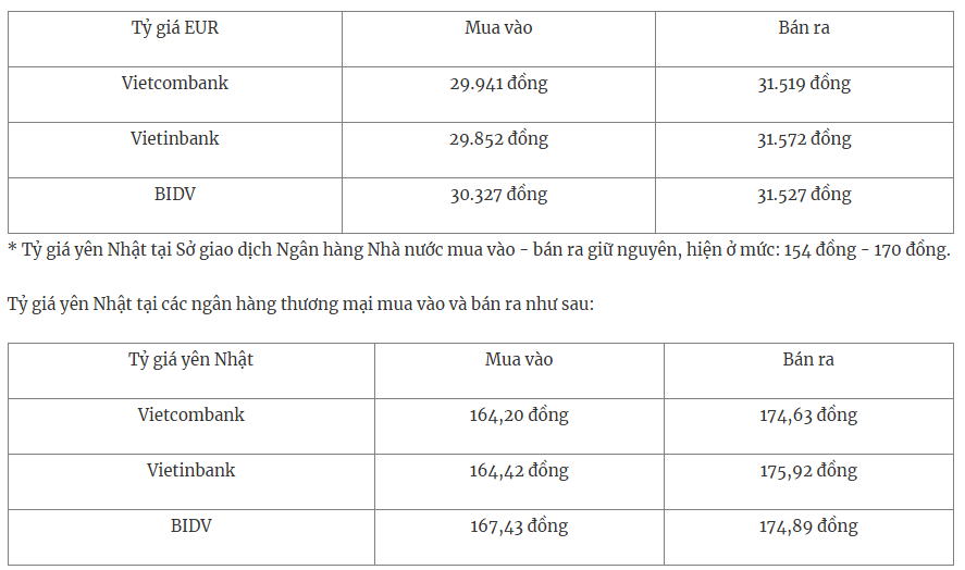 Tỷ giá EUR tại các ngân hàng thương mại mua vào và bán ra như sau: