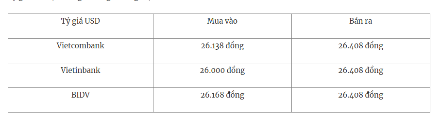 Tỷ giá USD tại các ngân hàng thương mại mua vào và bán ra như sau: