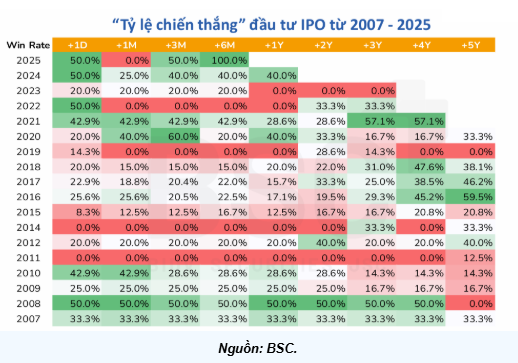 Hiệu suất đầu tư cổ phiếu IPO trên thị trường chứng khoán Việt Nam giai đoạn 2007 - 2025. Nguồn: BSC