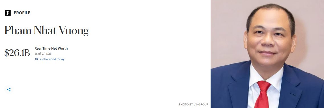Nhờ đà tăng giá cổ phiếu nên tài sản của tỷ phú Phạm Nhật Vượng cũng gia tăng đáng kể. Tính đến ngày 14/2, tài sản của tỷ phú giàu nhất Việt Nam đạt 26,1 tỷ USD, tăng hơn 1,1 tỷ USD (+4,5%), xếp hạng thứ 88 thế giới. Như vậy, tài sản của Chủ tịch Vingroup còn vượt qua cả tỷ phú John Tu, người đã xây dựng thành công thương hiệu Kingston và được mệnh danh là “ông vua” của các loại ổ nhớ di động. Tỷ phú John Tu hiện sở hữu 22,9 tỷ USD, xếp hạng thứ 101 trong danh sách những người giàu nhất thế giới.