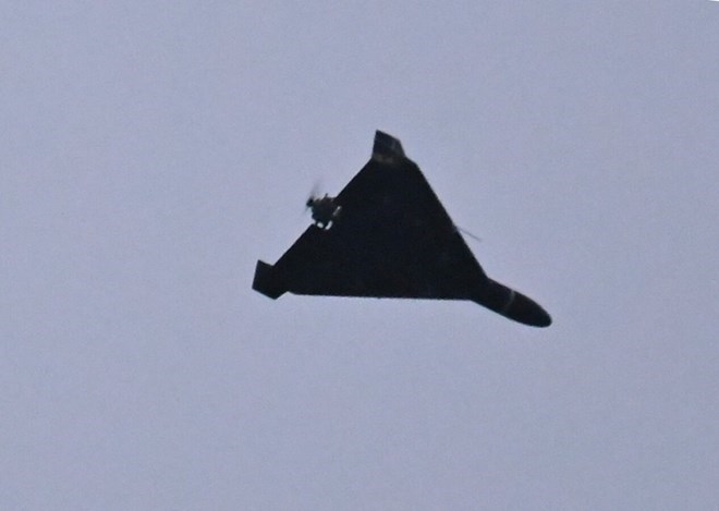 Drone Shahed 136 do Iran thiết kế, được quân đội Nga sử dụng bay trên bầu trời Kiev, Ukraina ngày 27.12.2025. Ảnh: AFP