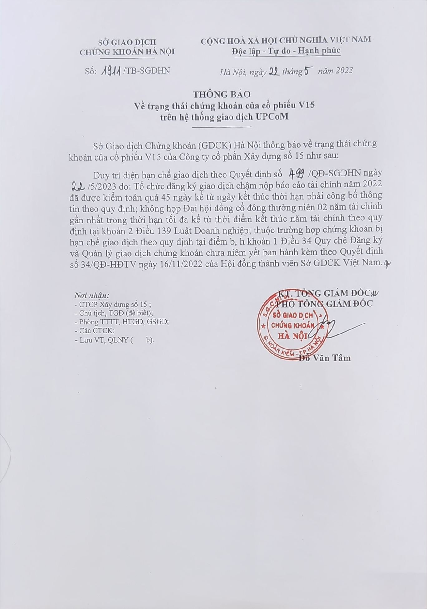 V15: Thông báo về trạng thái chứng khoán