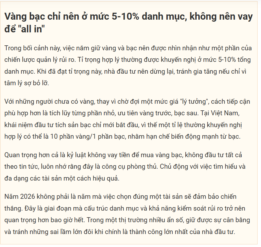 Rủi ro lớn nhất trong quá trình này chỉ là lựa chọn tài sản mà ở tốc độ và tâm lý: mua đuổi khi giá đã tăng mạnh, hoặc coi vàng bạc như công cụ lướt sóng ngắn hạn.