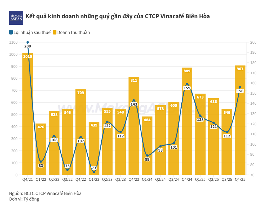 Sau khi trừ các khoản chi phí, lợi nhuận sau thuế quý 4/2025 của Vinacafé Biên Hòa đạt 156,2 tỷ đồng, giảm 1,8% so với cùng kỳ năm trước.