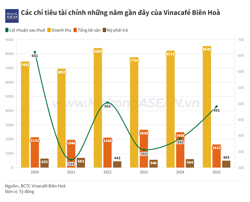 Vinacafé Biên Hòa công bố kết quả kinh doanh năm 2025 đã được kiểm toán, với doanh thu thuần 2.761 tỷ đồng, tăng 8% so với năm 2024 (YoY); lợi nhuận sau thuế đạt 518 tỷ đồng, tăng 16% YoY. So với kế hoạch đề ra, công ty vượt các chỉ tiêu theo phương án thấp (doanh thu vượt 2% và lợi nhuận vượt 10%); đồng thời tiệm cận phương án cao khi hoàn thành 93,6% kế hoạch doanh thu và vượt 4% mục tiêu lợi nhuận.