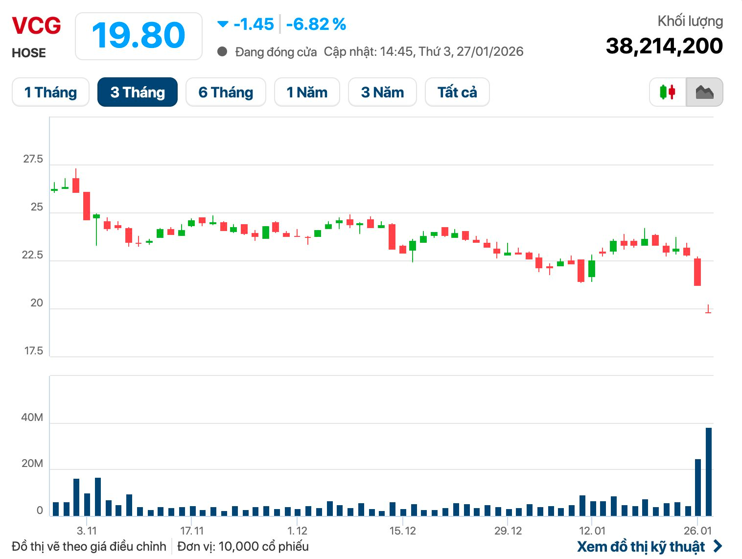 Đáng chú ý, đà giảm sâu đi kèm thanh khoản tăng vọt. Riêng phiên 26/1, khối lượng khớp lệnh của VCG đạt hơn 24,6 triệu cổ phiếu, trong đó dư bán giá sàn lên tới khoảng 18 triệu đơn vị.