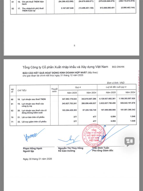 Tổng Công ty Cổ phần Xuất nhập khẩu và Xây dựng Việt Nam giải trình chênh lệch LNST quý 4/2025 so với cùng kỳ năm trước như sau: