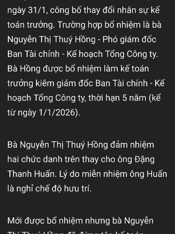 Tổng CTCP Xuất nhập khẩu và Xây dựng Việt Nam (Vinaconex, mã VCG), ngày 31/1, công bố thay đổi nhân sự kế toán trưởng. Trường hợp bổ nhiệm là bà Nguyễn Thị Thuý Hồng - Phó giám đốc Ban Tài chính - Kế hoạch Tổng Công ty. Bà Hồng được bổ nhiệm làm kế toán trưởng kiêm giám đốc Ban Tài chính - Kế hoạch Tổng Công ty, thời hạn 5 năm (kể từ ngày 1/1/2026).