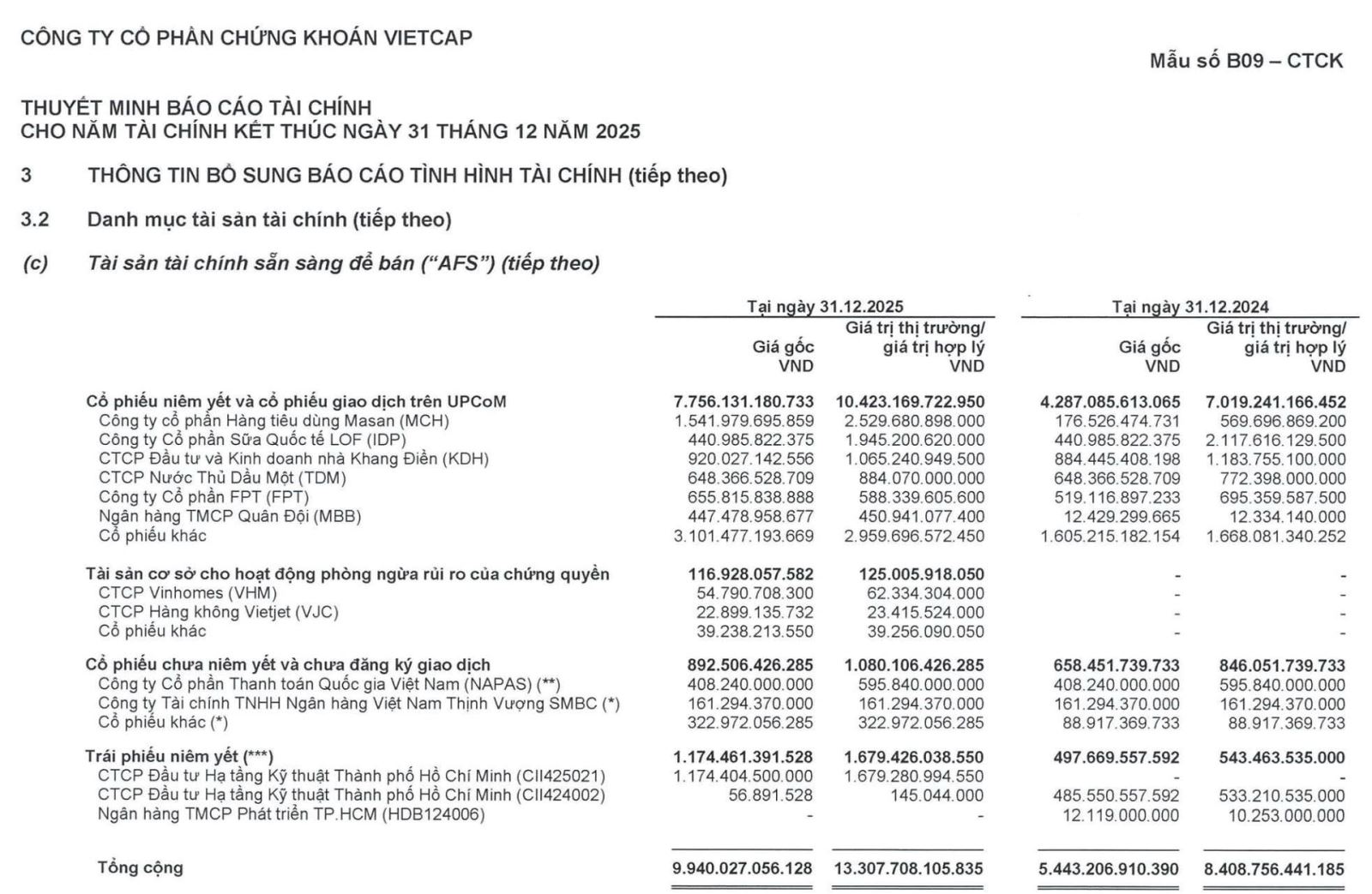 MCH (Công ty Cổ phần Hàng tiêu dùng Masan) được mua với giá gốc là 1.541 tỷ đồng. Giá trị thị trường thời điểm cuối năm 2025 là 2.529 tỷ đồng. Như vậy, Vietcap đang ghi nhận lãi tạm tính khoảng 987 tỷ đồng đối với khoản đầu tư vào MCH.