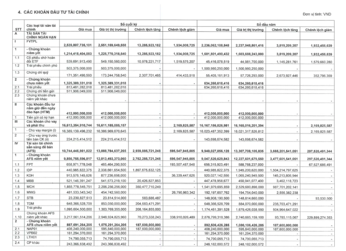 Tiếp theo, danh mục tài sản tài chính sẵn sàng để bán đạt 13.089 tỷ đồng, giảm nhẹ so với đầu năm. Danh mục chứng khoán AFS niêm yết tăng từ 9.047,5 tỷ đồng lên 9.857 tỷ đồng (giá gốc). Tại cuối quý I, công ty tạm lỗ 29% tại cổ phiếu FPT, lỗ 4% tại KDH và lỗ 5,6% tại MWG; ngược lại ghi nhận lãi gần 19% tại MCH và 31,6% tại TDM, bên cạnh lãi lớn từ khoản đầu tư lâu năm tại IDP (giá gốc 441 tỷ, lãi 1.897 tỷ đồng).