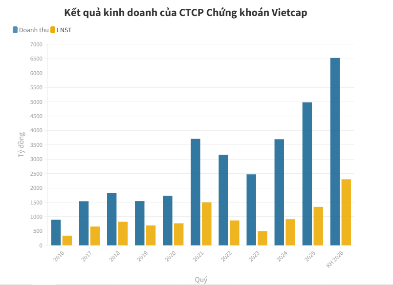 Cụ thể, Vietcap đặt mục tiêu doanh thu hợp nhất năm 2026 đạt 6.525 tỷ đồng và lợi nhuận trước thuế 2.300 tỷ đồng, lần lượt tăng khoảng 30% và 41% so với kết quả thực hiện năm 2025. Công ty cũng dự kiến mức cổ tức trong khoảng 5-12%.