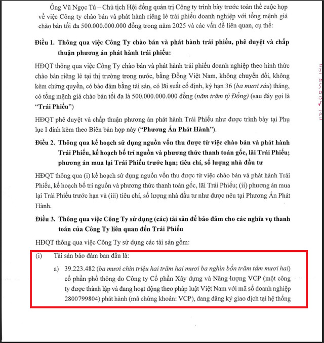 Đáng chú ý, Tài sản bảo đảm ban đầu là hơn 39,2 triệu cổ phiếuVCP. Trong đó, CTCP DH Holdings góp gần 14,8 triệu cổ phiếu, CTCP Đầu tư VSD gần12 triệu cổ phiếu; còn lại ông Vũ Đức Hạnh, Đoàn Mạnh Thường, bà Nguyễn Thị Hồngmỗi người hơn 4,15 triệu cổ phiếu.