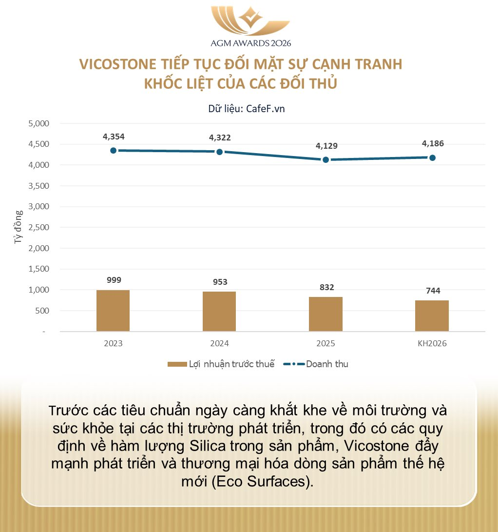 Theo báo cáo tại Đại hội, lãnh đạo công ty cho biết tình hình kinh doanh tại các thị trường lớn của Vicostone đều gặp khó khăn. Năm 2025, Công ty ghi nhận doanh thu thuần 4.128 tỷ đồng, lợi nhuận trước thuế 823 tỷ đồng, tương ứng 87,50% và 85,37% so với kế hoạch đề ra.