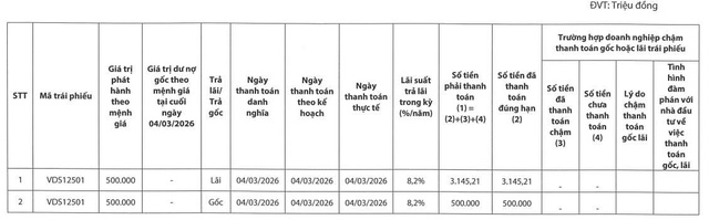 Cụ thể, ngày 4/3/2026 vừa qua, Chứng khoán Rồng Việt đã thực hiện thanh toán 500 tỷ đồng tiền gốc và hơn 3,1 tỷ đồng tiền lãi cho lô trái phiếu mã VDS12501, qua đó tất toán lô trái phiếu này đúng hạn.