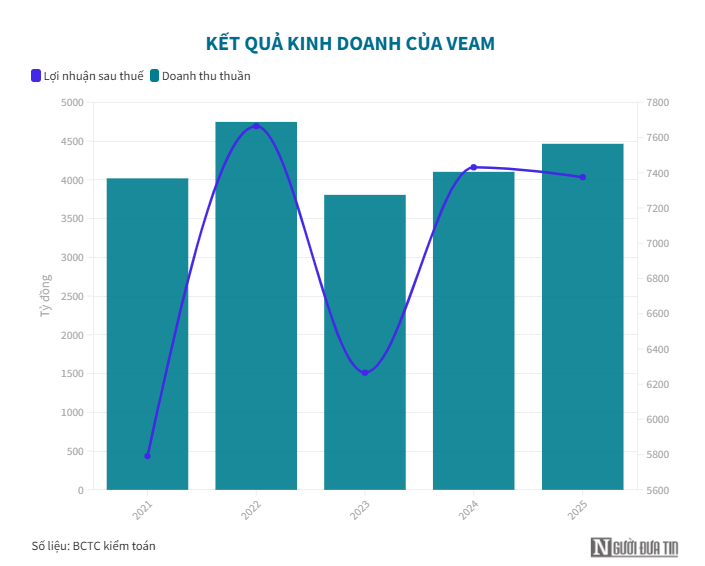 Tính chung cả năm 2025, VEAM ghi nhận doanh thu tăng trưởng 9% lên gần 4.500 tỷ đồng. Lợi nhuận từ các liên doanh giảm nhẹ 2% so với năm liền trước về 6.625 tỷ đồng.
