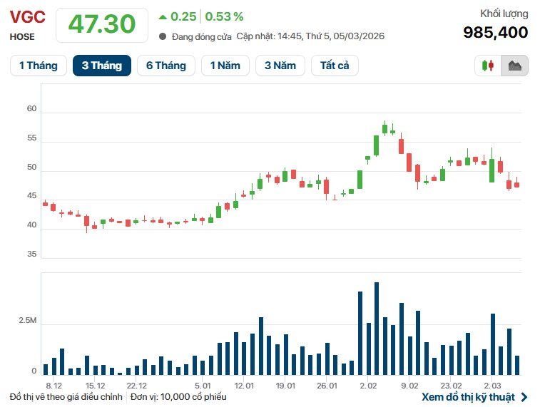 Trên thị trường chứng khoán, cổ phiếu VGC chốt phiên giao dịch ngày 5/3 ở mức 47.300 đồng/cp, vốn hóa thị trường đạt khoảng 21.200 tỷ đồng.