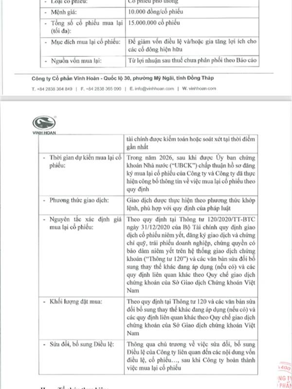 Công ty Cổ phần Vĩnh Hoàn thông báo tài liệu lấy ý kiến cổ đông bằng văn bản như sau: