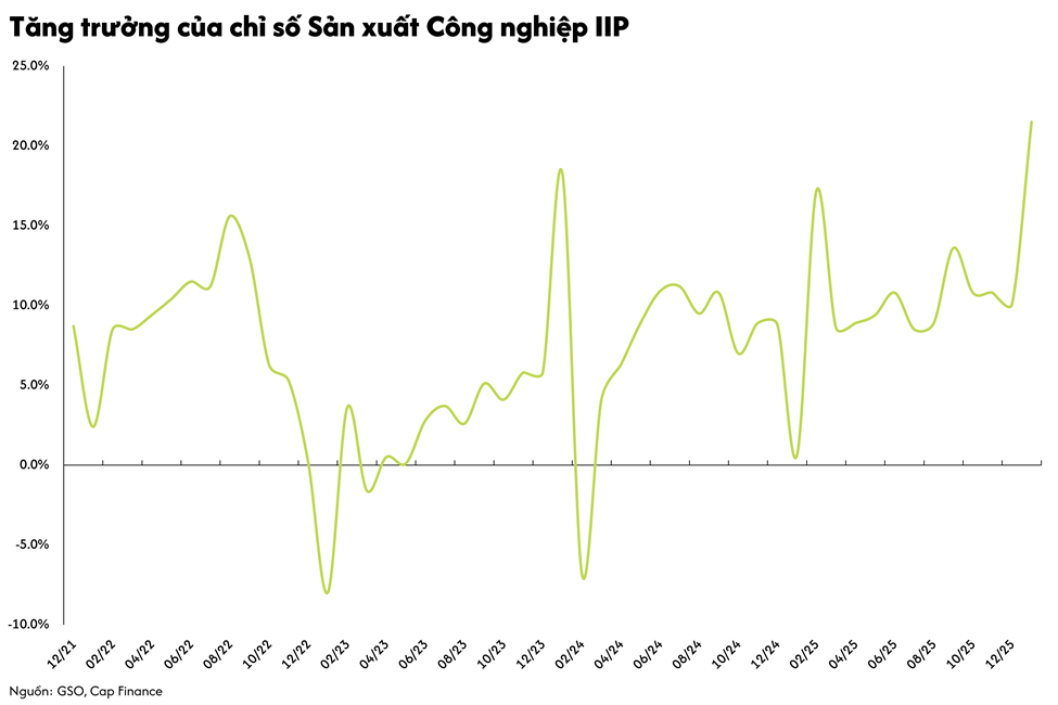 Theo số liệu vừa công bố từ Tổng cục Thống kê (GSO), chỉ số sản xuất công nghiệp (IIP) trong tháng 01 đã ghi nhận mức tăng trưởng bứt phá 21.5% so với cùng kỳ năm ngoái. Thực chất, con số này ghi nhận mức tăng trưởng đặc biệt lớn là do đợt nghỉ Tết Âm lịch 2025 rơi đúng vào cuối tháng 01, dẫn tới hoạt động sản xuất công nghiệp bị đình trệ sớm hơn. Vì vậy, khi so sánh số liệu cùng kỳ, tháng 01/2026 có tăng trưởng vượt trội. So với tháng 12/2025, chỉ số IIP này có sự sụt giảm nhẹ 0.2%.