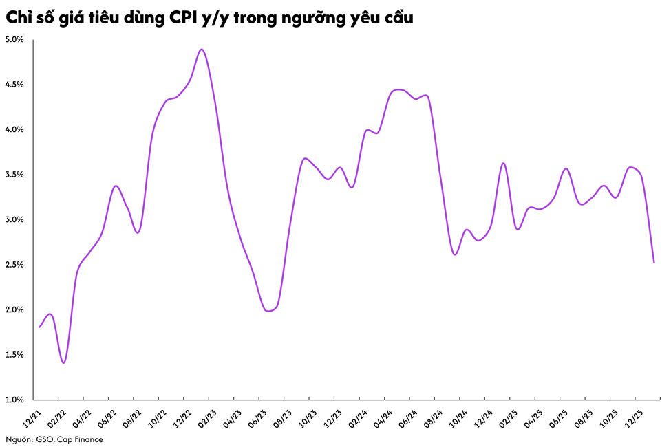Về mặt điều hành vĩ mô, chỉ số giá tiêu dùng (CPI) tháng 01 tăng nhẹ 0.05% so với tháng trước và 2.53% so với cùng kỳ năm 2025. Điểm đáng chú ý nằm ở lạm phát cơ bản khi chỉ số này chạm mức 3.19%, cao hơn đáng kể so với CPI chung. Sự chênh lệch này phản ánh áp lực giá cả đang dần chuyển dịch từ các mặt hàng biến động như thực phẩm, năng lượng sang nhóm dịch vụ và tiêu dùng thiết yếu.