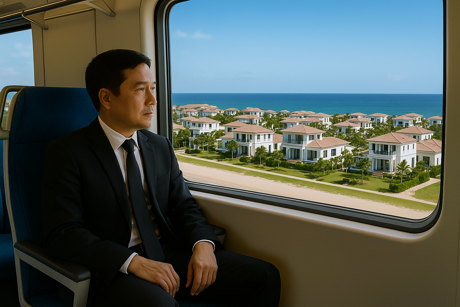 Vinhomes Green Paradise cách trung tâm TP.HCM khoảng 50 km đường bộ và cách Vũng Tàu khoảng 12 km đường biển. Để kéo gần khoảng cách, Vingroup dự kiến sẽ khởi công tuyến metro tốc độ cao 350 km/h nối dự án với ga Bến Thành sau một tháng nữa và vận hành thương mại vào đầu năm 2028. Khi ấy, thời gian đi từ trung tâm TP.HCM đến Cần Giờ sẽ giảm từ khoảng hơn 2 tiếng xuống còn 15 phút. Ảnh minh họa bằng AI.