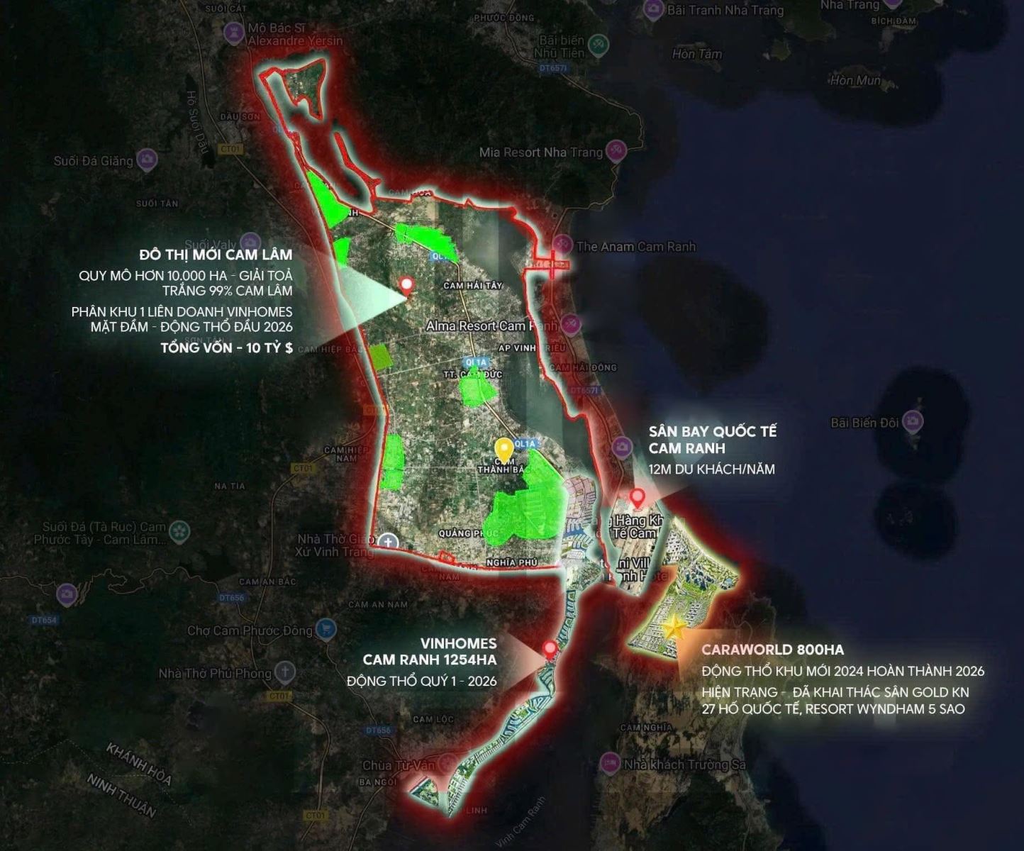 Khu đô thị mới Cam Lâm có tổng vốn đầu tư sơ bộ hơn 10 tỷ USD (260.200 tỷ đồng), không kể bồi thường 25.000 tỷ đồng. Dự án sẽ là nơi ở của 584.000 người, tương đương dân số của cả tỉnh Cao Bằng.