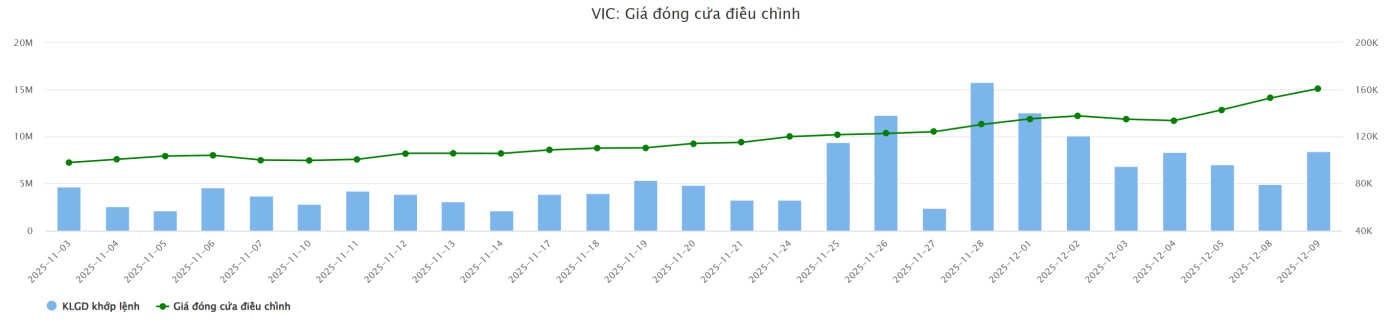 Đà tăng cổ phiếu VIC (đã điều chỉnh giá sau chia) đang kéo dài liên tục từ đầu tháng 12, tính đến nay đã tăng hơn 23%; còn nếu tính từ đầu tháng 11 là tăng hơn 68%; tính từ đầu năm 2025 thì tăng gần 8 lần.