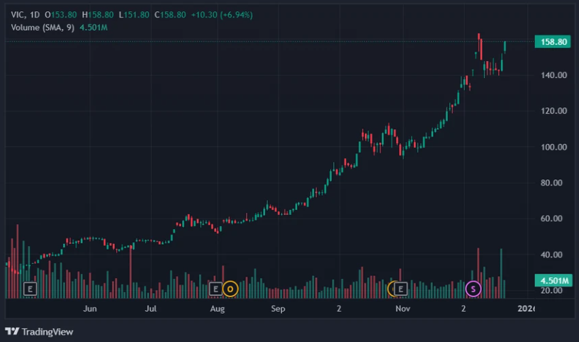 Thị giá VIC đóng cửa ở mức cao nhất từ trước đến nay. Ảnh: TradingView.