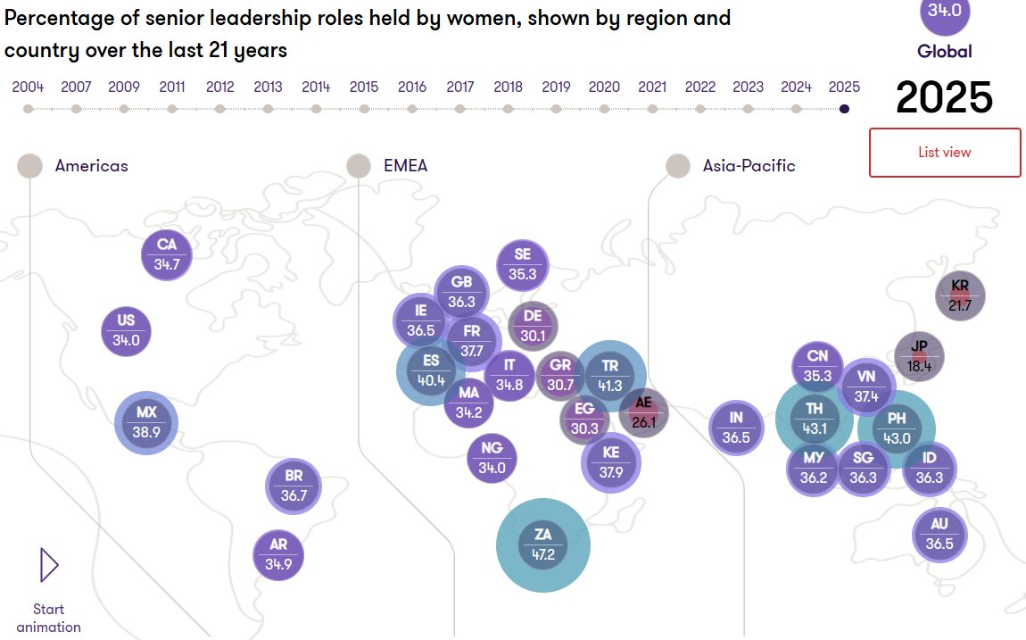 Tuy nhiên, không giống như Việt Nam, tỷ lệ doanh nghiệp có CEO là nữ trên toàn thế giới đã tăng nhẹ 2,6 điểm phần trăm kể từ năm 2024 lên 21,7%.