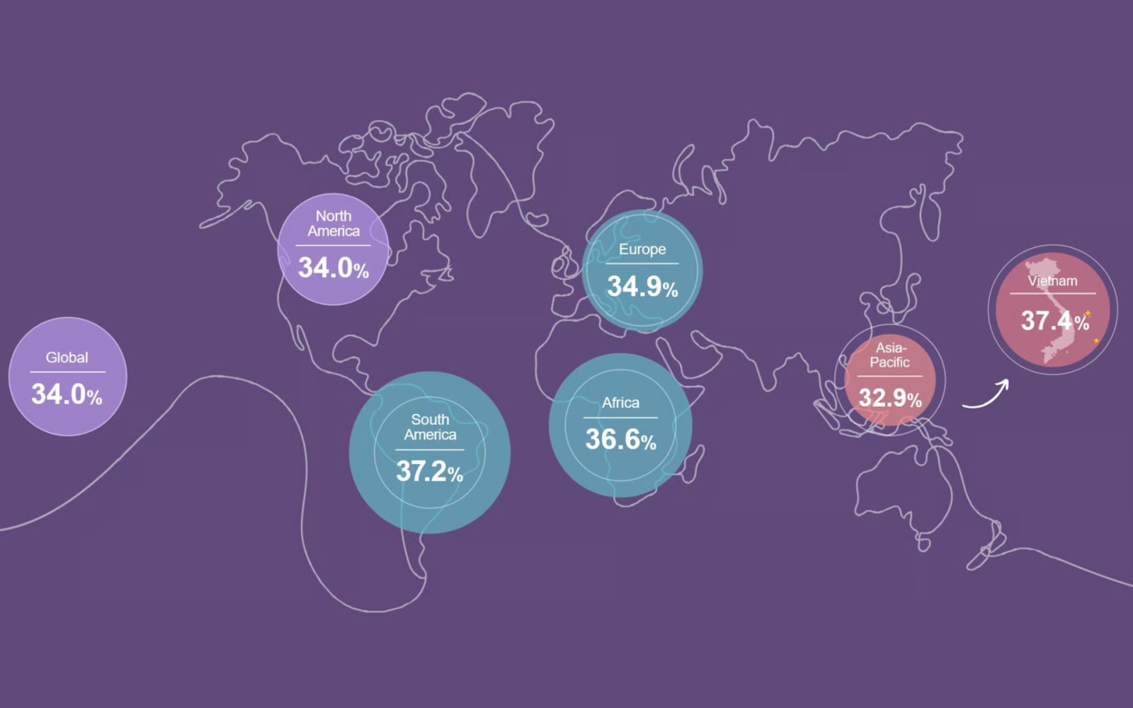 Tỷ lệ này cao hơn mức trung bình toàn cầu là 34% và dẫn trước nhiều khu vực kinh tế lớn như Nam Mỹ, châu Phi, châu Âu và Bắc Mỹ. Mỹ và Canada cũng "xếp sau" với tỷ lệ 34% và 34,7%.