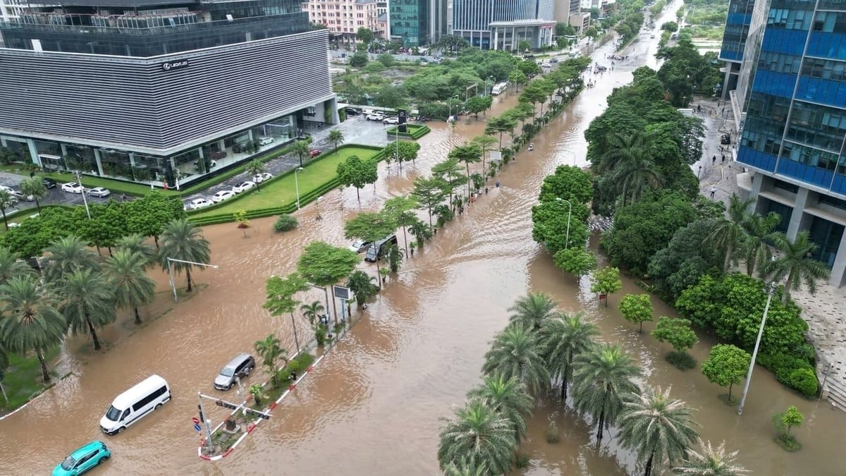Khu vực giao cắt giữa đường Phạm Hùng và Dương Đình Nghệ biến thành sông mỗi khi Hà Nội mưa lớn kéo dài. Ảnh: TP.