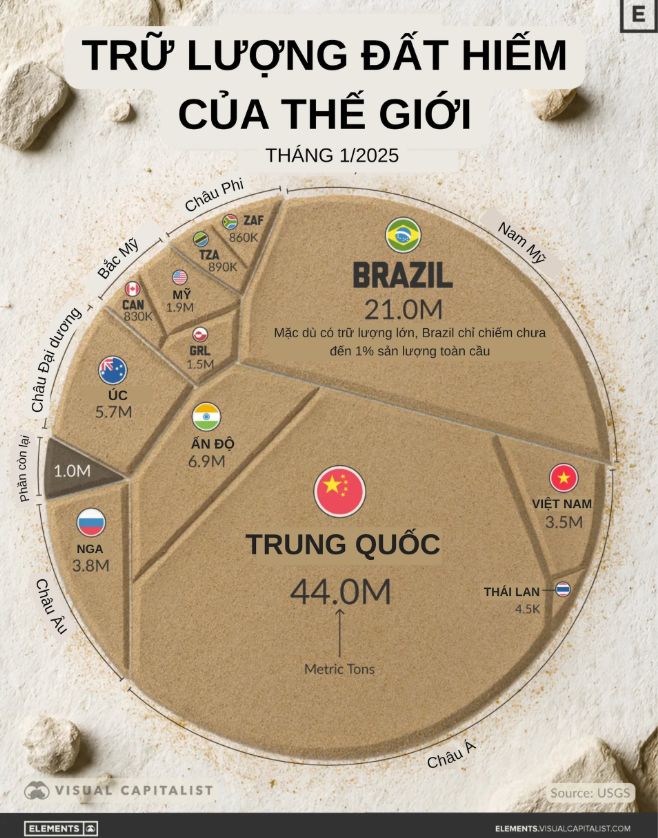 Theo số liệu được Cục Khảo sát Địa chất Mỹ (USGS) công bố, trữ lượng đất hiếm của Việt Nam hiện đứng thứ 6 thế giới, đạt 3,5 triệu tấn. Ước tính trữ lượng này lớn gấp gần 2 lần của Mỹ, gấp hơn 700 lần so với Thái Lan. Trong khi đó, Trung Quốc là quốc gia đứng thứ nhất thế giới với trữ lượng 44 triệu tấn.