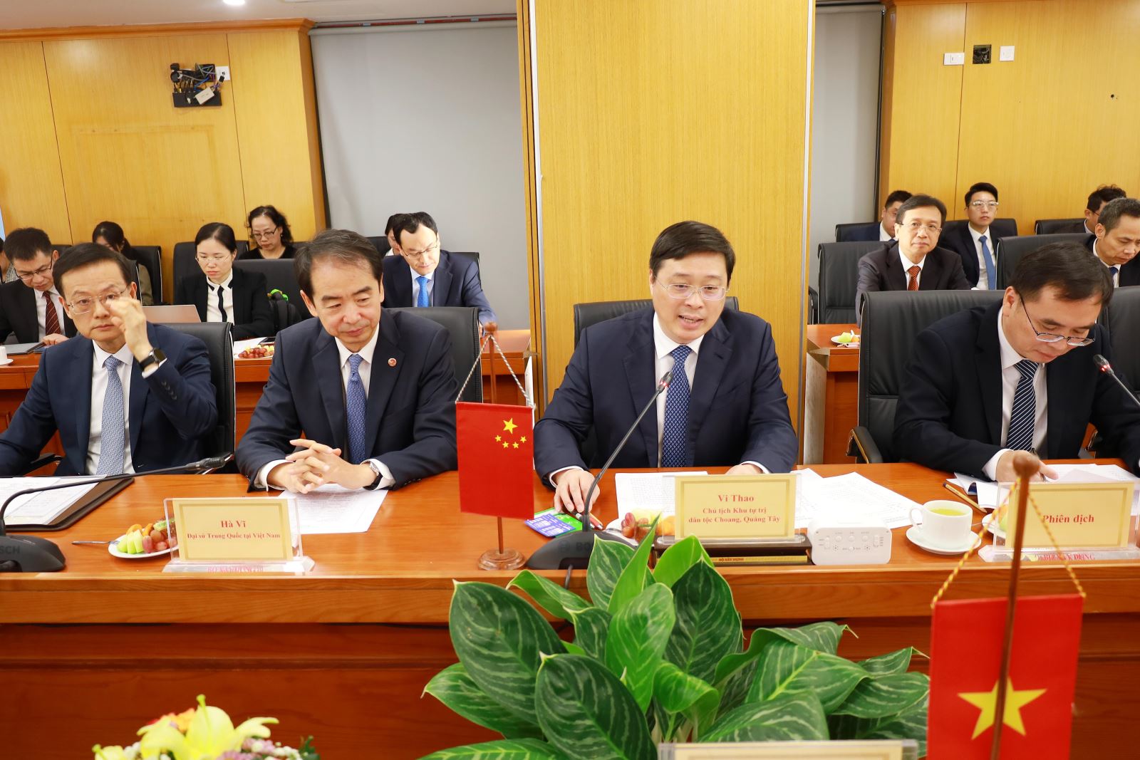 Phát biểu tại buổi làm việc, ông Vi Thao, Chủ tịch Khu tự trị dân tộc Choang, Quảng Tây trân trọng cảm ơn sự đón tiếp trọng thị của Bộ Xây dựng Việt Nam, đồng thời cảm ơn Bộ trưởng Trần Hồng Minh đã luôn quan tâm, ủng hộ hợp tác thiết thực giữa Việt Nam và Quảng Tây. Ông cho biết, trong những năm gần đây, dưới sự chỉ đạo chiến lược của lãnh đạo cấp cao hai Đảng, hai Nhà nước và sự hỗ trợ tích cực của Bộ Xây dựng Việt Nam, hợp tác kết nối hạ tầng giao thông giữa Việt Nam và Quảng Tây đã đạt được nhiều kết quả nổi bật.