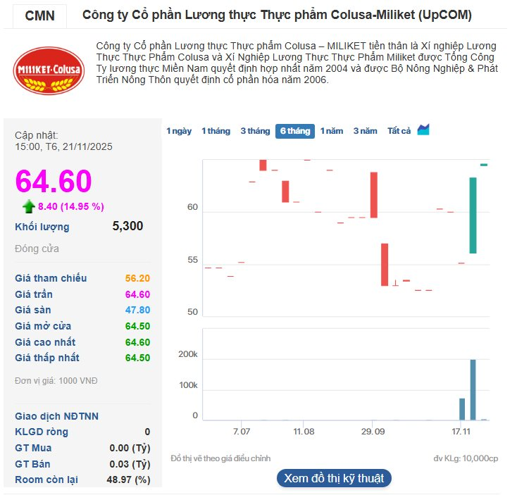 Phản ứng trước thông tin thoái vốn, cổ phiếu CMN trên sàn UPCoM đã ghi nhận những biến động mạnh về giá và thanh khoản trong tuần giao dịch vừa qua. Kết thúc phiên ngày 21/11, thị giá CMN tăng hết biên độ 14,95%, đóng cửa tại mức 64.600 đồng/cổ phiếu. Trước đó một ngày, mã này cũng ghi nhận mức tăng kịch trần với khối lượng khớp lệnh đột biến gần 200.000 đơn vị.
