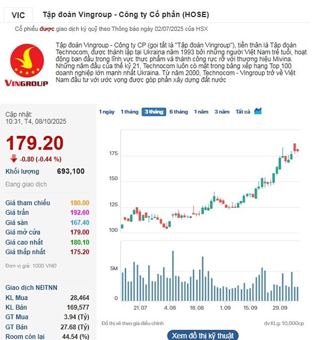 VN-Index “xanh” tích cực với thông tin nâng hạng, nhưng cổ phiếu VIC của Vingroup lại ngược dòng, quay đầu giảm điểm, sau khi lập đỉnh tại mức 180.000 đồng/cp.
