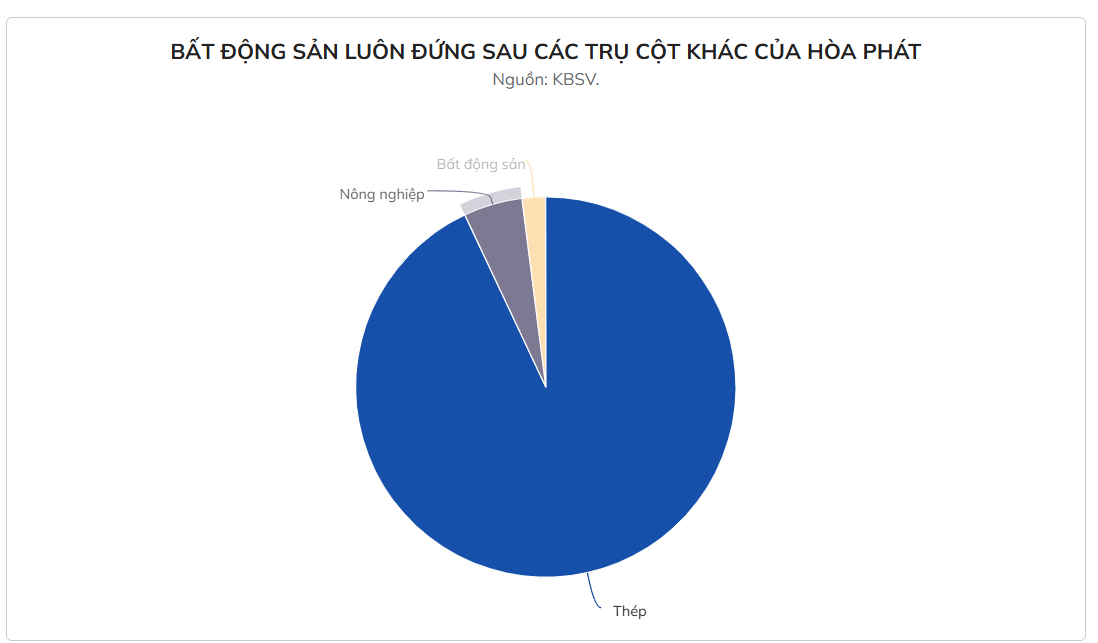 Dù vậy, tỷ lệ đóng góp của mảng bất động sản vào kết quả kinh doanh của "vua thép" vẫn khá hạn chế. Trong 9 tháng đầu năm này, Hòa Phát ghi nhận doanh thu thuần hợp nhất 109.939 tỷ đồng và lợi nhuận sau thuế 11.627 tỷ đồng. Trong đó, mảng bất động sản chỉ đóng góp khoảng 1% doanh thu và 6% lợi nhuận, thấp hơn đáng kể so với các trụ cột chính như thép và nông nghiệp.